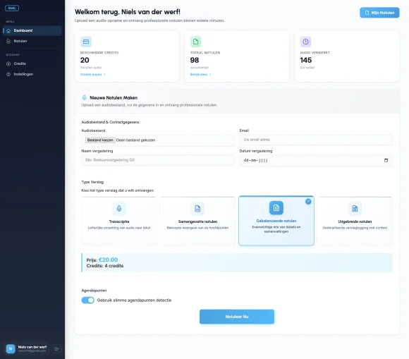 Upload je vergaderingsopname en ontvang binnen 30 minuten perfect gestructureerde notulen.